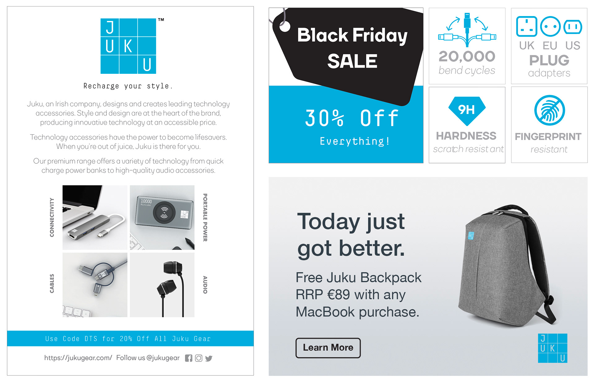 Juku is an Irish company dedicated to bringing technology that is beautiful as well as game changing, to the market. My work for them has included packaging, icon development, fliers, print advertising and digital banners.